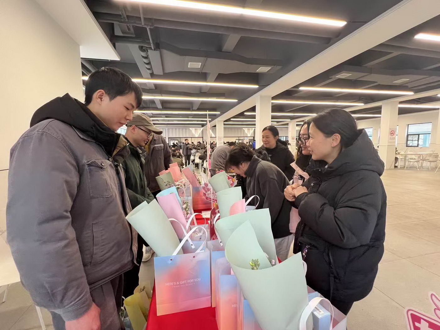 为庆祝第115个“三八”国际劳动妇女节,表达对全体女员工的关爱和祝福,3月7日中午,公司在两个园区食堂举办了节日福利派送活动,并由三德男神亲自赠送节日物资和鲜花,活动现场氛围感满满,女神们脸上了绽放着幸福的笑容。